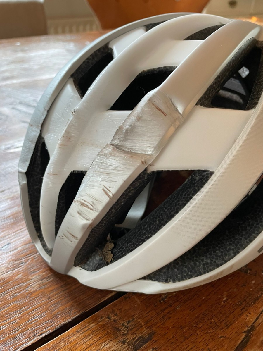 Rudy stuurt een fotootje van zijn helm en is blij dat hij er eentje op zijn hoofd had.
