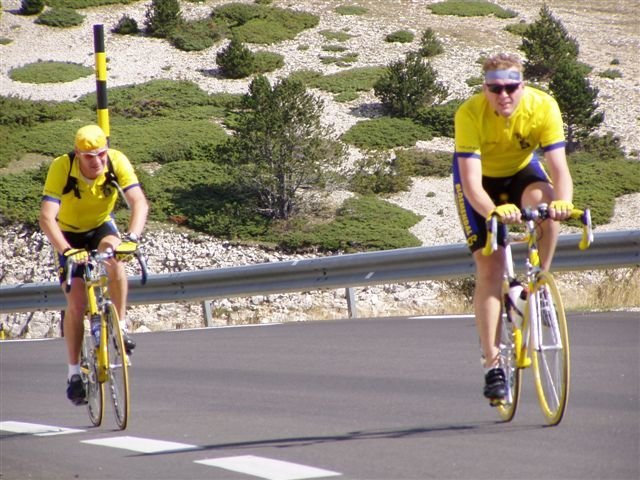 Herbert Bikker en Andre Meerman op de flanken van de Ventoux (2004) Andre was geen klimmer. Hij zei ooit toen hij werd ingehaald, “Als je er langer over doet, geniet je ook langer” Toen Herbert Bikker een lid inhaalde, kreeg hij te horen dat hij moest genieten van de omgeving. Het antwoord van Herbert: ¨Ik geniet dat ik je inhaal….¨. Zo geniet een ieder op zijn eigen manier.
