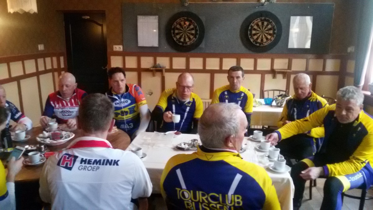 Samen met Henk fiets ik naar de Sporthal waar al weer veel blauw/geel staat te popelen om weer op weg te gaan.