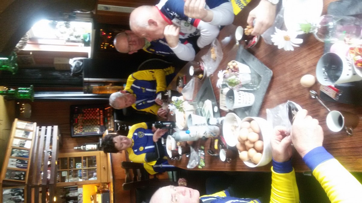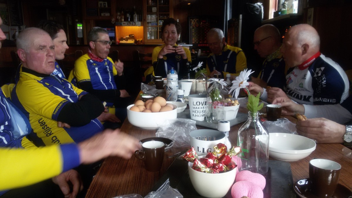Berend had ook een verrassing voor ons geregeld, iets dat we met Pasen waren misgelopen. Er stonden een paar schalen met heerlijke biologische eieren voor ons klaar. Echter die krengen waren zo heet dat we al na één ei de blaren op onze fikken hadden staan. Hier werden natuurlijk van allerlei grappen en grollen over gemaakt maar het belangrijkst was dat ze erg lekker smaakten. Velen hebben het niet bij twee eieren gelaten, dat hoefde ook niet want er waren er genoeg!