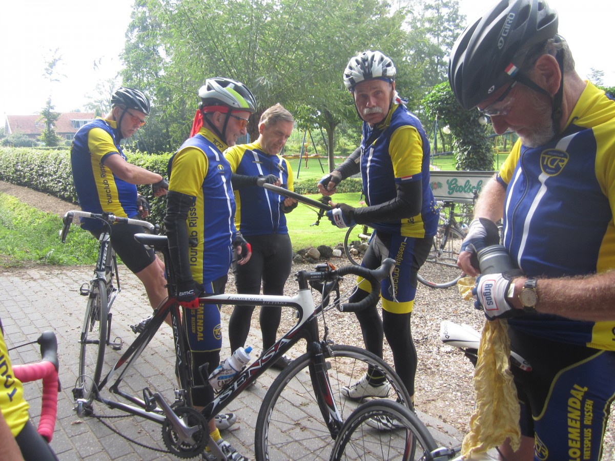 Hij had ons niet zo snel opgemerkt maar hij ziet ons op tijd en rent terug om het portier dicht te slaan zodat wij gewoon kunnen passeren. Gerda en ik rijden vooraan, en hij zegt lachend: Dat zou jammer zijn van die mooie dames!!! Even later zijn we bij ons koffieadres Cafe “Haak en Hoek”. De waardin is al druk in de weer om het terras voor ons schoon te maken en even later genieten we in de zon van de koffie en thee met appelgebak. Maar aan al het goede komt een eind en als we weer willen vertrekken ziet Arie S. dat hij lek heeft. Hans P. onze SUPER bandverwisselaar heeft alles snel verholpen. Dan komt het oppompen, dat is ook deze keer weer een issue. Johan B. en Johan K. hebben allebei de beste fietspomp (zeggen ze) en welke pomp gaat er nu gebruikt worden??? Johan K. wint het deze keer. Alleen het weer bevestigen van zijn pomp heeft nogal wat voeten in de aarde. Volgens de kenners duurt dit nog langer dan het verwisselen van de band. Nadat we allemaal uitgelachen zijn kunnen we eindelijk vertrekken. We fietsen nu zonder problemen weer naar het oosten van Nederland en in Elsen verlaten de Entersen de groep na iedereen bedankt te hebben voor de leuke morgen. Wat kan fietsen toch heerlijk inspannend, ontspannen zijn. Bijna 120 km. hebben we deze morgen weggetrapt en zonder moeite en met veel plezier.