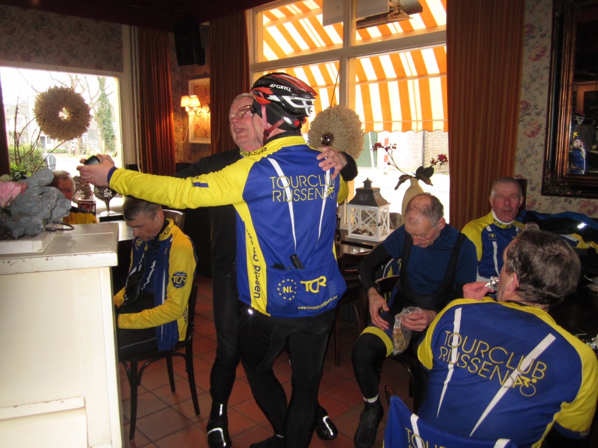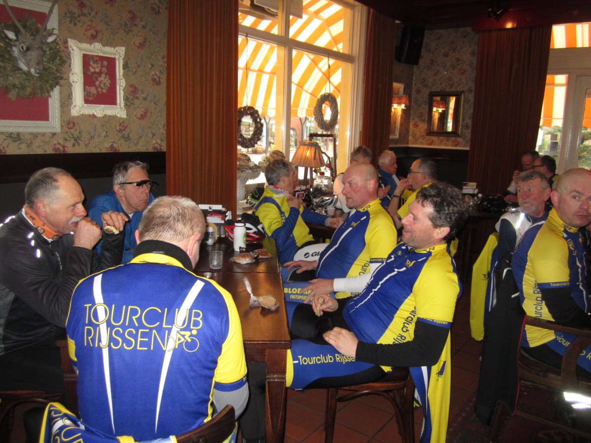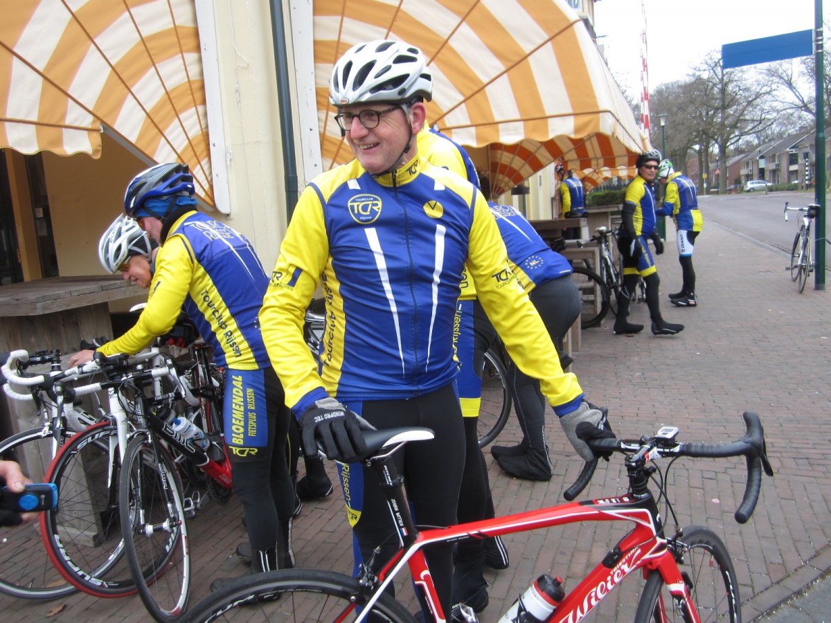 Verslag: Na een gezellig avondje was het zaterdag morgen gewoon op tijd uit bed om als toerleider te fungeren.Bij de sporthal was het al redelijk vol,tegen 9 uur was het bomvol.De T 2 ging op stap met meer dan 30 fietsers, Jans de eerste groep en Johan in z,n spoor de tweede,In een aardig tempo ging het richting Borkeld,waar de eersten al schreeuwden,iets kalmer,uiteraard kun je niet iedereen tevriend houden,dus gewoon een redelijktempo erin houden,via allerlei binnenwegen richting Zenderen ,volgens de tweedegroep stond er veel wind ,waar ze dat op bazeerden begrijp ik niet ,de eerste groepheeft er weinig last van gehad (zijn waarschijnlijk iets sterker).Aangekomen bij de kasseien van Oene via Delden werd echt het kaf van het koren gescheiden.Toen we bij cafe De Buren aan kwamen hadden we dik 60 km op de teller.Bij de koffie werd alom de toerleider geprezen om zijn bijzondere mooie route,alzeg ik hetzelf,het was ook bijzonder mooi ,of Arie en Benny het hiermee eens zijn valt te betwijfelen.Bij de koffie moest onze toerleider de koffiejuffrouw erop wijzen dat het weleens handig kan zijn om met een kan rond te gaan,wat ze dan ook promp deed,de dank was zeer groot,zoiets hoort ook bij de taak van een leider,wat een gewoon fietser niet ziet.Om een beetje bij de afgesproken 85 km te blijven werd er besloten om zo snel mogelijk richting Rijssen te koersen.Al met al een zeer geslaagde en goed georganiseerde tocht door uiteraard het goede werk van onze toerleider