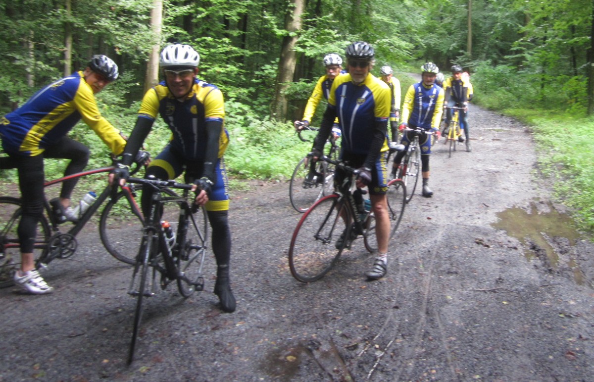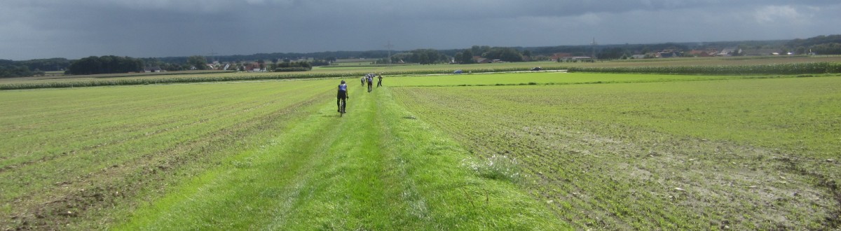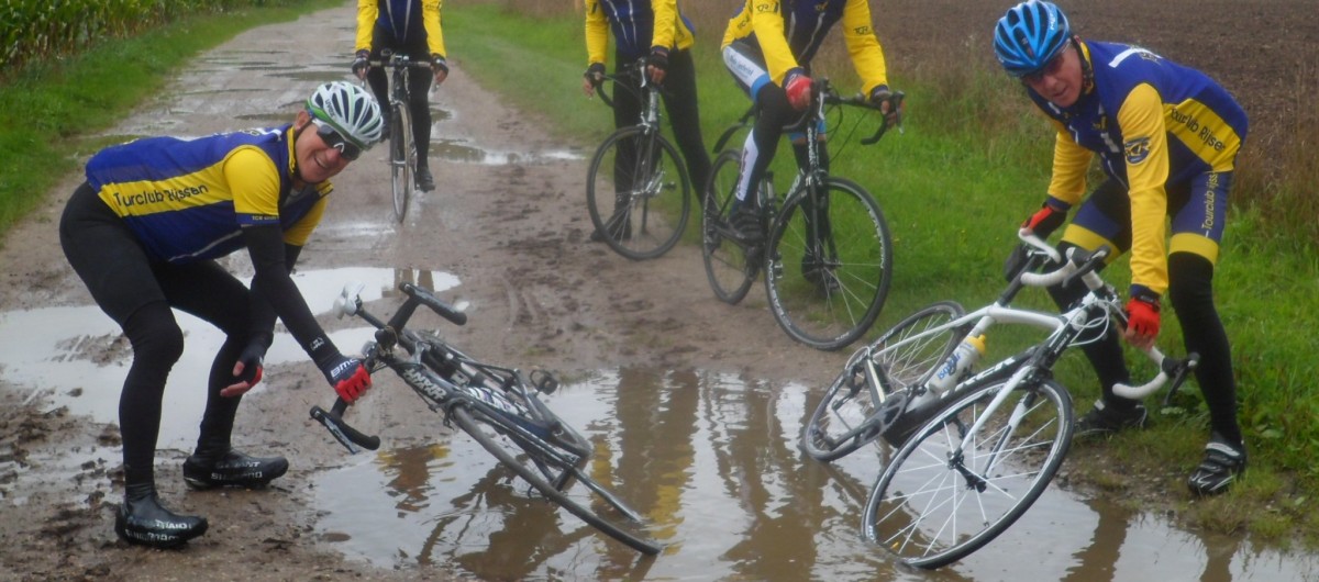 paden met steenslag, al spoedig reden we door de modder en kregen we te maken met grote plassen water. Onze centurio had de meeste moeite om goede doorwaadbare plaatsen te vinden. Op deze manier ging ons gemiddelde drastisch naar beneden en waren we in principe een gemakkelijke prooi voor de oude Germanen die we her en der tegenkwamen. We reden in de buurt van Glandorf langs enkele kleine meertjes waar jonge Germanen voor het dagelijkse voedsel probeerden te zorgen door op Karpfen te vissen. Inmiddels was het gaan regenen en werd ons tenue daarbij aangepast. Ons legioen trok voort en bereikte Bad Laer. We maakten een tactische omtrekkende beweging van ruim 12 km en kwamen bij ons koffieadres in Bad Rothenfelde. Koos was zo blij dat hij deze pleisterplaats had bereikt dat hij spontaan in volle lengte de bodem omarmde. Daarbij liep hij geen schade op.