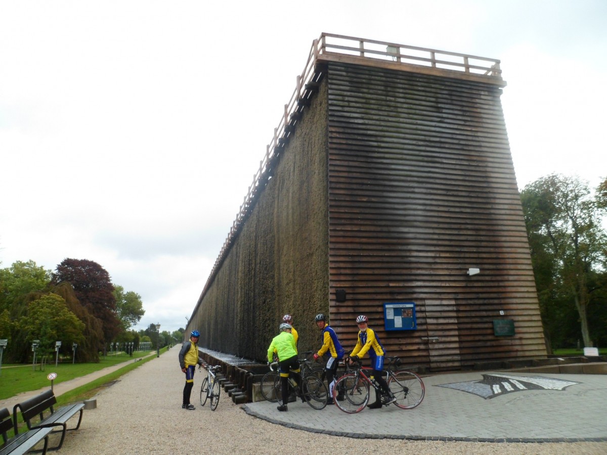 Na de pauze was het nog slechts 25 km. Vol goede moet gingen we op pad. Binnen een kilometer was het al raak en begon een steile klim. Voor mij weer” hummelen” geblazen. Toen het asfalt overging in bospad en waren we blij dat geen krijgslustige Germanen zich in onze omgeving ophielden. Wel zagen we een groep geciviliseerde wandelaars. De afdaling was voor enkelen nog moeilijker,gevaarlijker dan de klim. Het was nat en glad en wonder boven wonden geen valpartijen en niemand reed lek. In de verte ontwaarde we de nederzetting Bad Iburg. Kenmerkend haar versterking, het kasteel bovenop. Het is mogelijk om dit bouwwerk te bezichtigen. We daalden af naar het park bij deze plaats. Het orakel stuurde ons weer naar boven. Dit gevaar gingen we uit de weg. we besloten om regelrecht naar het zwembad in Lienen te fietsen. We kregen de mogelijkheid om ons te douchen of te zwemmen. Jan Bakker ging als ware legionair in zijn wielerbroek het diepe in. Een nieuwe retro steil geboren.