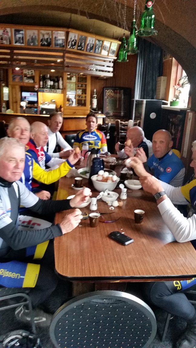 Zaterdagochtend erg vroeg. Regen, droog, regen, motregen, kortom doet ie het of doet ie het niet! Mijn wettige echtgenote verklaard me voor gek om zo mee te gaan, maar dat doet ze wel vaker dus is niets nieuws. Kwart voor acht, het druppelt nog wat. Ik trek het regenjack en de stoute, o nee, de overschoenen aan en rij naar de Sporthal. Het wordt droog. Aangekomen ontdek ik niet een massale opkomst zoals de laatste weken gewend. Toch druppelt er nog wat na en om acht uur staan er voor T4 toch maar weer 16 rijders in de startblokken. Steeds meer leden weten T4 te vinden en da’s mooi. Wel missen we ons damesgezelschap. Hadden waarschijnlijk andere BBHH. We starten met als toerleider Berend. Hij heeft, eigenlijk inmiddels een traditie, weer de Paaszaterdag gekozen voor een rit naar Rossum. Koffie en eierenpunt ’t Peuleke. Er zitten een drietal “vreemde eenden in de bijt”, althans zo lijkt het aan de uitmonstering. Twee ervan zijn door Berend gecharterd mee te rijden omdat het waterpoloseizoen ten einde is en deze beide heren wel eens wat anders wilden. Het mag gezegd worden, het edele drietal heeft geweldig meegefietst. Compliment. Met een windkracht 4 à 5 hoofdzakelijk in de rug racen we richting Rossum. Het kost Berend de nodige moeite de club in toom te houden zo voor de wind, waarbij diverse keren kreten als : wie mot ok nog terug en dan teg’n de poes (lees wind) in”, geslaakt werden. Er kwamen ook nog een paar extra stops vanwege wat lekke banden. Dat is het probleem van een nat wegdek, want we hebben onderweg geen druppel regen meer gehad, alleen maar gesputter van voor je rijdende medestrijders. Berend had en heeft opnieuw weer een mooie route door het oost Twentse landschap op de Garmin. Je ziet dat er een Duitse inslag in het landschap en de boerenbedrijven is als je zo dicht bij de grens fietst. “Je ruikt de lente geurtjes” werd door iemand opgemerkt. Voor alle duidelijkheid: dat was voordat er de nodige eieren genuttigd konden worden. Uw schrijver dezes voelde zich dan ook niet aangesproken. Bij het Peuleke aangekomen kon onze toerleider met hulp van Gerrit, aan de slag met het wisselen van een binnenband terwijl de rest zich tegoed deed aan koffie en eieren in alle soorten en maten. Witte, wij noemden dat vroeger haneneieren, bruine, chocolade eitjes, het lag er voor het grijpen. Klasse. En naar ik naderhand begreep niet van die gouden eieren die we een paar jaar geleden in Bronkhorst tot ons namen. Dus voor TCR een aanzienlijke besparing op de uitgaven. Ja, en dan moet je ook nog terug op Riessen an. En ook dat lukte. Mede doordat onze toerleider de route wat verlegde en we behoorlijk vaak langs bebost gebied reden waar de wind vanaf de Noord/Oostkant niet direct vol tegen was. Helm af voor dit inzicht van de toerleider. Zonder verder oponthoud kwamen we tegen kwart voor een Rijssen weer binnen na een prachtige tocht. Met dank aan Berend. Klasse.