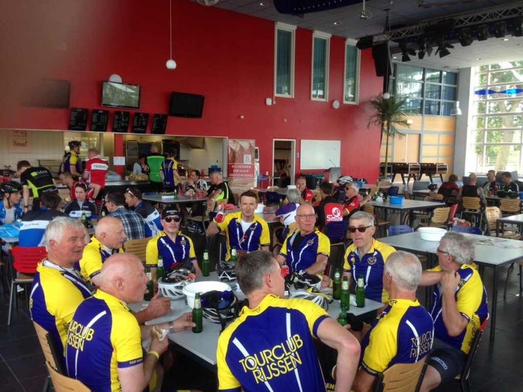 Onze TL heeft er zin in deze morgen, de bonnen snel inleveren snel de koffie (thee) naar binnen en hop weer op de fiets. Na Lemelerveld volgt natuurlijk de Lemele berg hier komen wij de T3 achterop en enkele van ons durven het aan om tijdens de beklimming de T3 te passeren. Je moet het maar durven. Via de Hellendoornseberg gaan we naar de Holterberg, hier na buigen we af richting Laren en met de wind in de rug via nog steeds mooie rustige binnenwegen op naar de RijssenseBerg en kort hierna zitten wij in kantine Reggesteyn te genieten van een lekkere vette hap.