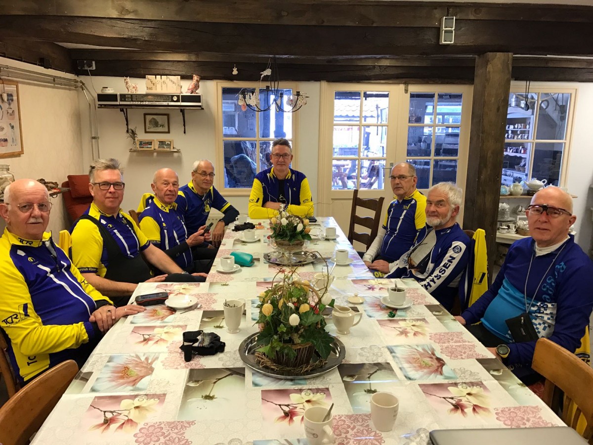 We stapten weer op en lieten Wim achter. Met de andere Wim als tourleider en de route van Wim G op de Garmin genoten we van het prachtige voorjaarsweer. Er was weinig verkeer en er werd lekker gereden. We moesten naar Boekelo. Bij Erve Geurts wachtte ons de koffie. Wim Grooten had het prima geregeld. Alleen de Garmin kon niet aan de nieuwe tourleider wennen. Ze was erg recalcitrant. Het duur niet lang of loo werd wel erg letterlijk genomen. We verplaatsten ons op onze stalen rossen als lichte cavalerie onder leiding van een oude ervaren ritmeester over een breed zandpad dwars door het loo. Uiteindelijk werden alle beschikbare middelen ingeschakeld om Erve Geurts te vinden. We bleken dus een fout adres in onze gedachten te hebben. Toen we de navigatie meer vertrouwen gaven, kwamen we aan bij ons koffieadres. We hebben daar het vorige seizoen ook koffie gedronken. Ik was in ieder geval door Boekelo goed op de verkeerde trapper gezet. De bewoners hadden voor ons een tafel klaar staan met eigen gebakken cake en koek. Prima koffie en bij het afrekenen betaalden we 1 euro per kop met een vrije gift voor de bijlage. We stapten weer op en reden naar Delden. Plots een zat Gerrit Troost op de fiets als een jachthond die voorstaat omdat hij wild op het spoor is. Warempel links van ons stonden vier reeén in het weiland. Voor de Groenebrug bij Delden stuurde Wim ons langs het kanaal. Met de wind in de schoot het mooi op. De afgesproken kilometers zouden we ruim halen en dat begon merkbaar te worden. Door Elsen ging het naar Rijssen toe. De wind vervelend tegen met een fantastische zon op ons gezicht. Na ruim 70 km kon ik mijn fiets in de garage ophangen met dank aan Wim en Wim.