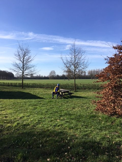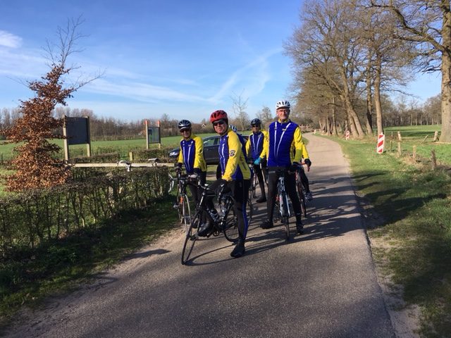 Ik heb even moeten nadenken over het opschrift. Bewust heb ik kapitalen gebruikt dat wil zeggen: hoofdletters. Ik kom hier verder in het verhaal op terug. T6 heeft een app waarin iedereen staat die een telefoon heeft die hiervoor geschikt is. Wim onze tourleider van dienst deze zaterdag had ons allen vrijdag nog even het tijdstip van vertrek doorgegeven. Half negen en niet om negen uur. We stonden met negen man klaar. Enkele vaste deelnemers hadden afgezegd. We vertrokken precies op tijd en Wim had de cadans meteen goed te pakken. Hij trapte met noeste tred door het Schwarzwald en ik vroeg me af wat er op dit begin tempo zou volgen. Richting Markelo kregen we het T6 tempo weer snel onder de knie. De rust in ons kleine peloton werd merkbaar toen de onderlinge gesprekken opgang kwamen. We fietsten door Elsen en staken achter Enter de weg naar Goor over. Nog maar een paar honderd meter op de Kolhoopsweg en onze tourleider minderde vaart stapte van de fiets en gaf aan dat hij last van kramp had. De opmerkingen waren niet van de lucht en werden door de prachtig blauwe hemel terug gekaatst. Wim probeerde het nog een keer, maar gaf al snel aan dat het niet te doen was. Er stond daar een bank om te picknicken en Wim zette zich daar neer. Hij vroeg Wim van de Noort om de Garmin over te nemen zodat we zijn route konden volgen. Er werd aan Wim gevraagd of hij wel thuis kon komen, of dat we misschien mee moesten gaan. Wim kwam met de opmerking dat zijn vrouw hem eventueel zou kunnen ophalen. We waren immers nog dicht bij Enter.