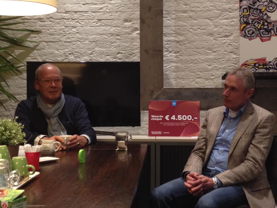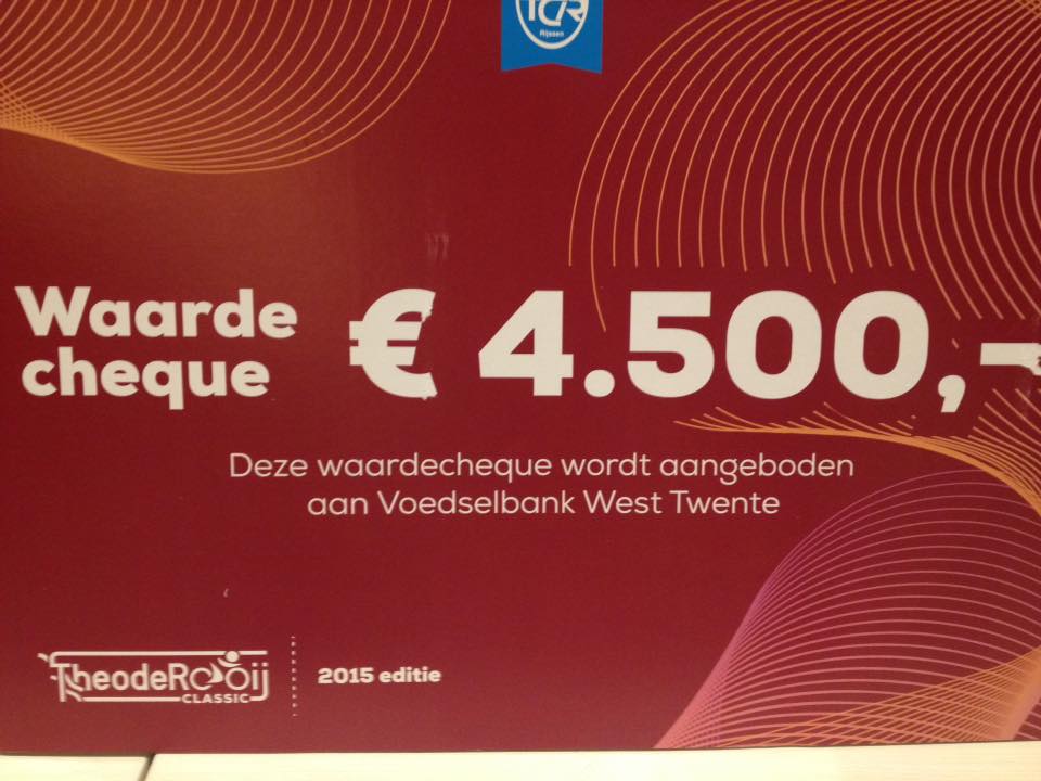 Na een openingswoordje van de voorzitter van de commissie TdRClassic Gerrit Wessels, overhandigde Theo de Rooij een cheque van 4500 euro !!! aan het bestuur van de Voedselbank.