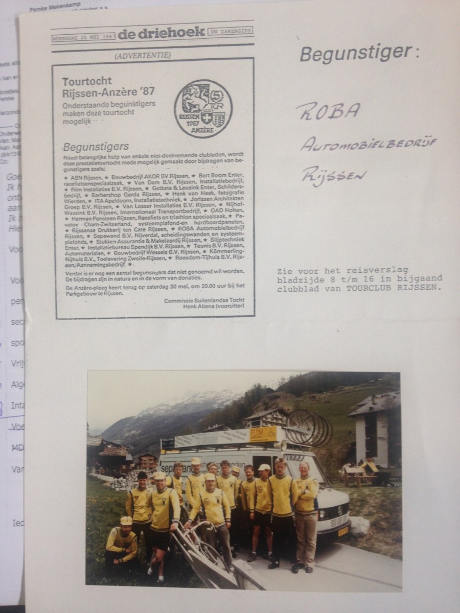 - Al snel leerde het boekje dat het om een TCR tocht ging in het jaar 1987. Een aantal leden organiseerde een fietstoertocht van Rijssen naar Anzere (Zwitzerland)