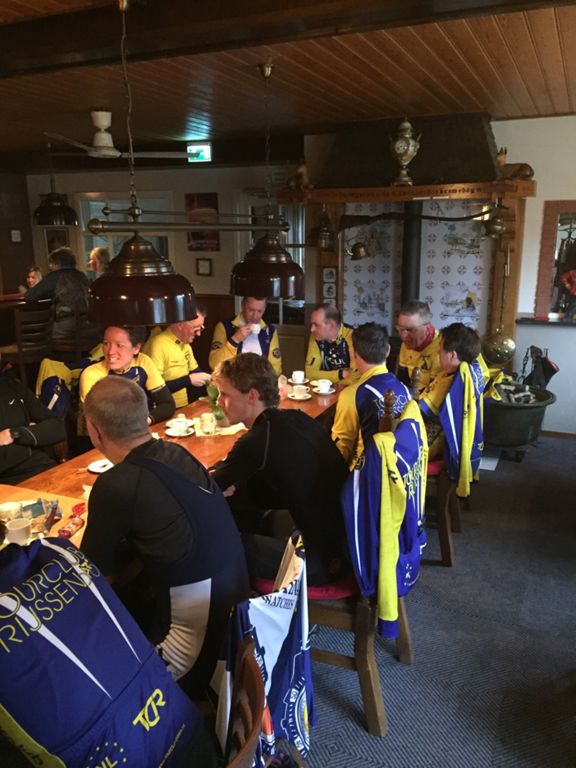Iets voor tienen belanden we bij een gezellig restaurant en worden warm welkom geheten door de kastelein. Hij serveert heerlijke warme koffie en voor wie dat wil een stuk appeltaart met een dot echte slagroom. Helemaal droog hebben we het niet gehouden, een miezerig regentje noodzaakt een aantal om gebruik te maken van de CV-radiatoren om handschoenen en bandana’s te drogen. In een gesprek met de kastelein blijkt het geen probleem te zijn om op 6 juni de verzorgingspost in zijn cafe te verzorgen, ook weer geregeld. Fijn die Twentse ¨can do¨ mentaliteit.