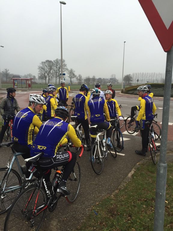 Het koffiedrinken duurt even iets langer dan normaal en de knippe van Rene is een stuk dunner op de terugweg. Via Daarlerveen rijden we om Wierden heen terug naar Rijssen. Theo moet 5 km voor Rijssen zijn blaas legen, schijnt een oud-profrennerskwaaltje te zijn, als Vz van de cie TdRC wacht ik keurig (de rest jakker verdacht hard door…), het kost me moeite om in zijn wiel te blijven om het gat dicht te rijden. Voorin hebben ze het door dat we naderen, want het tempo gaat verder omhoog, ¨de rotzakken¨, denk ik. Gelukkig kent TCR ene Bart Scholten, sociale jongen, die zich terug laat vallen en ons in 1 ruk naar de groep rijdt. Daar zie ik Willy op kop stampen, die moet hoognodig weer aan het werk, want die kan zo zondag mee in Parijs-Roubaix.
