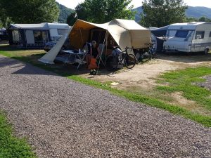 Als we naar de staanplaats rijden met de tenttrailer er achter, zien we overwegend senioren nieuwsgierig naar ons kijken.