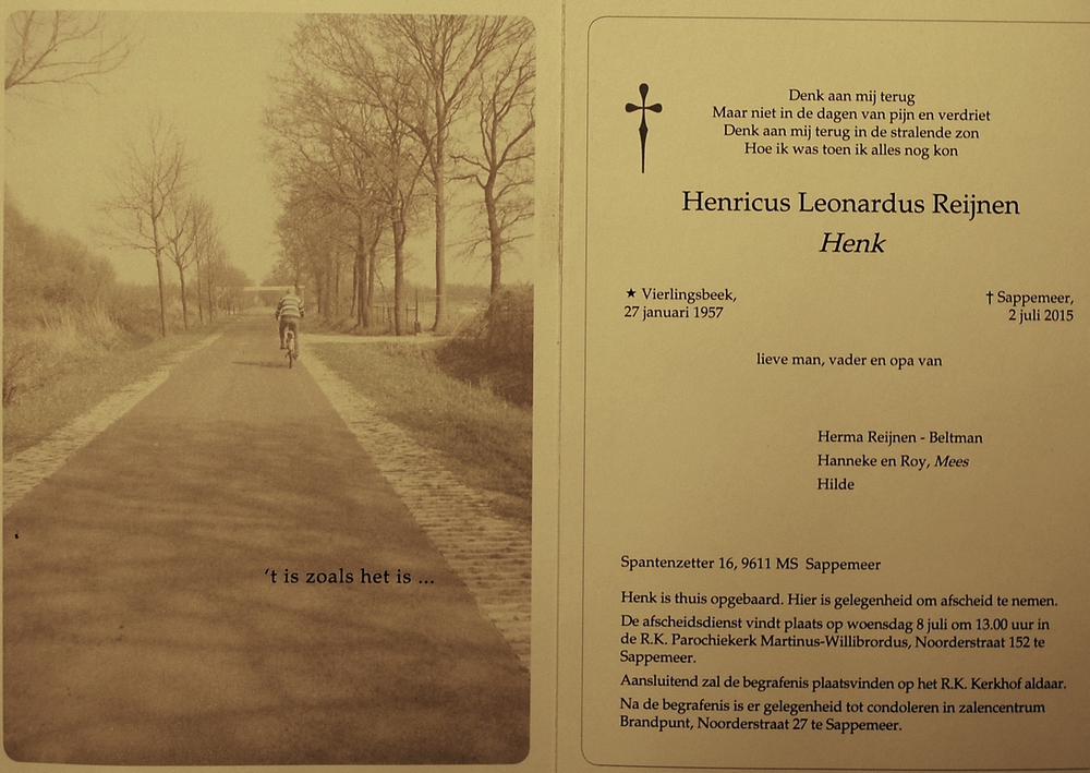 Rouwkaart Henk Reijnen [one_whole boxed=”true”] [/one_whole] Gelezen: 76 Door Gerrit Wessels|2015-07-13T20:40:11+02:0004/07/2015|Redactie|Reacties uitgeschakeld voor Rouwkaart Henk Reijnen Deel dit verhaal, kies je platform! WhatsAppE-mail