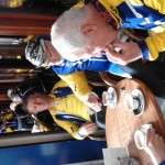 Peter had deze morgen op verzoek van een van de jongens een rit naar Ootmarsum gepland,helaas de persoon was zelf deze morgen niet aanwezig.We gingen via Ypelo en de doorbraak bij Almelo richting Reutem van hieruit naar Ootmarsum maar het koffie adres wat Peter in gedachten had was net de troep aan het opruimen,er bleek nl. kermis te zijn na bijna het hele dorp doorgereden te hebben zagen we nog een terras waar we buiten konden zitten stel je voor in November.met onze vieze kleren kon je ook niet in nette stoelen binnen zitten.Er kwamen nog wel wat gasten op de koffie en die werden allemaal van harte welkom geheten door de geel/blauwe kolonie uit Rijssen.Na de koffie zijn we via Herthme weer naar huis gefiets het was een vieze pruttel vanmorgen, ik was amper thuis of het begon behoorlijk te regenen dus weer mazzel gehad.