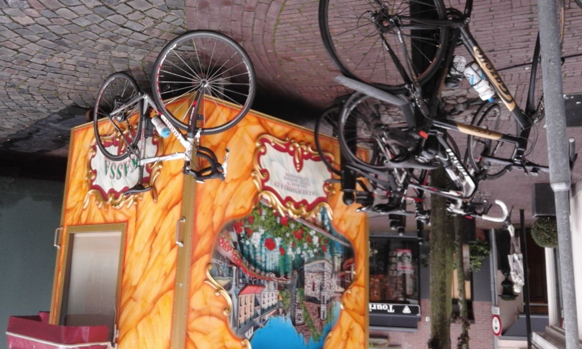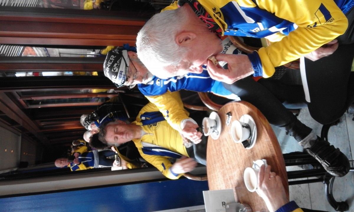 Peter had deze morgen op verzoek van een van de jongens een rit naar Ootmarsum gepland,helaas de persoon was zelf deze morgen niet aanwezig.We gingen via Ypelo en de doorbraak bij Almelo richting Reutem van hieruit naar Ootmarsum maar het koffie adres wat Peter in gedachten had was net de troep aan het opruimen,er bleek nl. kermis te zijn na bijna het hele dorp doorgereden te hebben zagen we nog een terras waar we buiten konden zitten stel je voor in November.met onze vieze kleren kon je ook niet in nette stoelen binnen zitten.Er kwamen nog wel wat gasten op de koffie en die werden allemaal van harte welkom geheten door de geel/blauwe kolonie uit Rijssen.Na de koffie zijn we via Herthme weer naar huis gefiets het was een vieze pruttel vanmorgen, ik was amper thuis of het begon behoorlijk te regenen dus weer mazzel gehad.